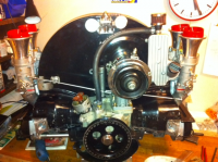 jeg måtte sveise inn "utsparinger" til gasserne i viftehuset. og bruke bensintilførselen på toppen av gasseren. smal motor=mye jobb. er det verd det? vet ikke....