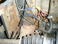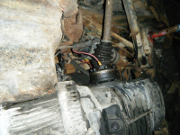 Legg merke til den tjukke raude kabelen som henger midt i bildet her..... den står det 12volt på heile tida og den henger og dingler under motoren her, og gjett om det gnistrar om du er borti den Øyerulling Bilen er/var ein sjølvantenneleg dynamitt!!