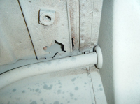All rust vart slipt vekk og so tok eg å trua støvsugaren langt oppetter rammo opp mot forstillingen for å få vekk laus rust og drit. Holet som slepp inn sand og drit vart tetta og området vart malt