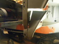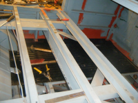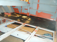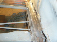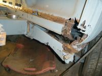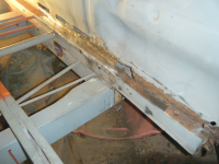 her ser me sovidt restane etter forsterkingen til sidepanelet, som eg kappa av. vuderte å lappa den gamle, men fant ut at da var bedre med ny. i bakgrunnen har eg merka opp for å kappa av litt av golvbjelken. pga eg må ha tilgang til d-stolpen