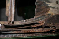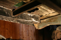 Etter en rengjøring av undersiden og nøye undersøkelser fant jeg noen flere ruststeder. Heldigvis ingen store overaskelser! Litt rust i den ene (utriggeren)?!? på høyre side foran, noen hull i gamle setefester i gulvet, noen småhull i kanalen på høyre side som kan lappes på inn- og utside.. Siden bilen skal bli en camper, har jeg ikke planer om å sette inn seter, derfor har jeg bare sveiset inn nye gulvstykker uten å ta meg bry med å lage nye fester osv.(dette var faktisk det første jeg sveiset av alt, så nå er jeg ikke så fornøyd med arbeidet.. men lar det være foreløpig så kan jeg heller ta det igjen når jeg tid og overskudd. Jeg er ikke redd for at det ikke skal holde). Jeg vil ha treplate som gulv senere så da synes ikke dette så godt.. gleder meg til å bli ferdig med rusten og få begynt med innredningen, håper dette blir like etter nyttår.. Her er noen bilder fra gulv og utrigger: Her oppdaget jeg litt rust. Heldigvis ikke noe utover det man kan se på bildet..