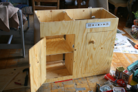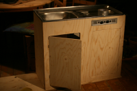 Slik så kjøkkenbenken ut da jeg satte den sammen i går. Fått inn dører, skillevegg og en hylle. ved siden av vasken kommer det en manuell vannpumpe som er forbundet med vanntanken man ser på forrige bilde.