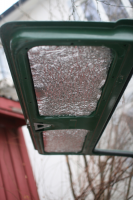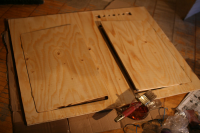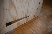 Jeg funderte en del på hvordan jeg skulle skjære ut skapdørene, da jeg ikke har tilgang på noe annet enn en stikksag. Et sted må man jo begynne, så jeg brukte 1mm kappskive på vinkelsliperen og lagde et lite kapp nederst i døra. Det var nok til å få plass til stikksagen og kjøre en runde rundt. Fungerte overraskende bra. Ulempen er at man får et lite "brannsår" i platen, men det kan alltids slipes bort eller males over. Det er minimalt: