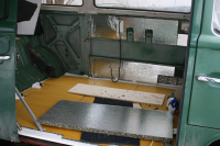 jeg har skapet baki på siden, å det i taket, å kjøleskap å vask, å setet inn mot vinduet, har også et bord som har sittet i en van som skal byttes bordplate på Glad så skal få laget det høye skapet bak fører.