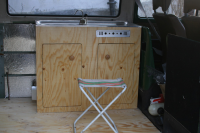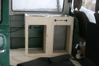 Slik så kjøkkenbenken ut da jeg satte den sammen i går. Fått inn dører, skillevegg og en hylle. ved siden av vasken kommer det en manuell vannpumpe som er forbundet med vanntanken man ser på forrige bilde.