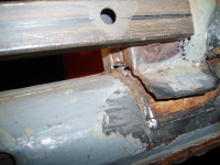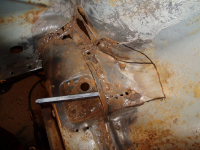 Betre bilde av det,, Denne falsen er på sjølve kanalen og fester den til forsterkingsplata, eller rear cross member so da haita på fint. Legg merke til att eindel av punktsveisa er oppeten av rusta.. Det skal nevnast att denne falsen fortsetter til venstre og INN imellom ytre og indre innerskjerm plata.