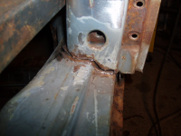 So tar me ein kikk over på andre sida av bilen, som er den bedre sida. Der ser me eit hol i gjennom forsterkingsplatene og inn i kanalen. Frå og med 69modellen var det eit inspeksjonshol bak kanalen, og det skal vera ein plugg over holet. Pluggen detter av, vatn og drit kjem inn, og elendigheiten er eit faktum, som på den dårlege, høgre, sida..