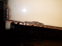 På innsida av dørstolpen bak, ligg ei plata som er bretta ut over kanalen, Og den er heilsveist rundt heile kanten. Tysjen visar sveisen, som er begravd i karosserikitt og gammal maling