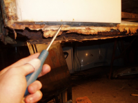 P1015506.jpg (96.73 KB. 733x550 - vist 1530 ganger.) So tar me ein kikk over på andre sida av bilen, som er den bedre sida. Der ser me eit hol i gjennom forsterkingsplatene og inn i kanalen. Frå og med 69modellen var det eit inspeksjonshol bak kanalen, og det skal vera ein plugg over holet. Pluggen detter av, vatn og drit kjem inn, og elendigheiten er eit faktum, som på den dårlege, høgre, sida..