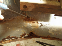 Eit(dårleg) bilde av kanalen lenger ned. Skrujernet peker på kanten av ei ekstra forsterkingsplate som ligg ytterst bak kanalen her. Totalt er det også her 3 plater utanpå kvarandre,, er det rart det rustar!?