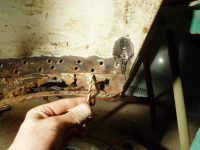Masse boring framme og! Legg merke til dei punktane rett under dørstolpen. Ei malingskrapa er fin å skilla platene med etter boring, unngå bruk av meisel då den krøllar sund den tynne innerskjermplata.