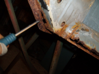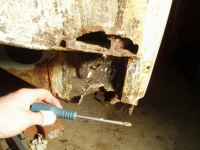 P1015493.jpg (113.57 KB. 733x550 - vist 1631 ganger.) Dårleg bilete, men her ser me kor rusta ting er under her.. Må lagast ny plata i endane her.
