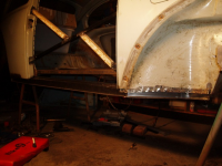 P1015480.jpg (97.09 KB. 733x550 - vist 1846 ganger.) VIKTIG: Karosseriet MÅ avstivast med ei ramma innvendig før du fjerner noko som helst kanal. Dette er fordi att døropningane ikkje skal flytta seg under surgery.. Ja for varmekanalen er jo eit av dei viktigaste berande elementa i karosseriet. NB: denne ramma er ikkje god nok, dette var eit av punkta som var endra undervegs, kjem meir info om dette seinare.