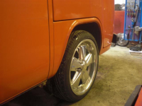 På topp? Jeg gjentar, på topp, eller for å si det på en annen måte, justert på det høyeste. jøran er en litt eldre mann soim sikkert har kjørt nok rundt i skam senka biler, å velger vel å kjøre på topp, å ikke slite ut alt under der hehehe  Vel, vi skal på langtur med bilen, og vi er to karer med 100 kg. pluss i vekt som skal sitte over hjulene. Med senkeforstillingen på topp kombinert med senkespindler og dobbeltvirkende gassdempere, unngår vi subbing i innerskjermene. Denne blir absolutt lav nok for en gammel mann
