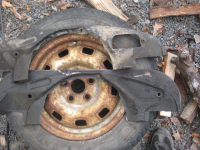 Dette var alt som var igjen i tillegg til bolten selvsagt. ]Den gamle bolten var av typen som ekspanderer ved hjelp av skruen. Den nye var en "hylse" med bolt igjennom. Denne "hylsa" skulle vise seg å bli dagens mareritt. Den var veldig trang, men da jeg fikk den nesten igjennom ville den verken ut eller inn. Det var da jeg merket at noe kanskje var litt skjevt. Fikk til slutt boret ut "hylsa" og satt inn den gamle. Da så jeg at denne ikke stod i 90 grader i forhold til aksling i girkasse. Først trodde jeg at jeg hadde boret skjevt, men det er altså den delen av akslingen som kommer forfra som er bøyd. Jeg måtte løsne denne fremme slik at jeg kunne få på koblingen. Så måtte jeg presse den sideveis for å få den på:
