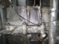Så tenkte jeg at jeg like gjerne kunne bruke bolter. Da klarte jeg å ødelegge gjengene i det ene hullet. Av med alt igjen. Ut med pumpa. Kappa opp en gjengestang jeg hadde i 4 lange pinnbolter. Skrudde de inn så langt at jeg kunne kjenne de på innsiden. Målte og sjekket på "støvsugeren" plassering på boltfester. Fant da ut at første plan var riktig, Medfølgende plate erstatter gammel. Men da fikk jeg et nytt problem. Den delen av braketten som er til bolten som går igjennom i bunnen gikk i mot blokka.