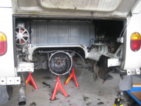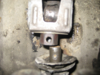 Dette var alt som var igjen i tillegg til bolten selvsagt. ]Den gamle bolten var av typen som ekspanderer ved hjelp av skruen. Den nye var en "hylse" med bolt igjennom. Denne "hylsa" skulle vise seg å bli dagens mareritt. Den var veldig trang, men da jeg fikk den nesten igjennom ville den verken ut eller inn. Det var da jeg merket at noe kanskje var litt skjevt. Fikk til slutt boret ut "hylsa" og satt inn den gamle. Da så jeg at denne ikke stod i 90 grader i forhold til aksling i girkasse. Først trodde jeg at jeg hadde boret skjevt, men det er altså den delen av akslingen som kommer forfra som er bøyd. Jeg måtte løsne denne fremme slik at jeg kunne få på koblingen. Så måtte jeg presse den sideveis for å få den på: