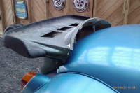 Fikk tak i et godt, brukt anlegg for 500.- + frakt. Selger nye på nettet for ca. 2.000.- Skifter absolutt alt, har kjøpt Haynes bok, har koplingsskjema. Jeg lodder alt og "smelter" krympestrømpe over loddingen. Må modde mye for å få vingen til å passe ja. Er ikke sikker på om jeg vil ødellegge vingen, men tror jeg må det for at den skal passe "bedre". Først setter jeg vingen på i låsen på bakskjørtet, og legger lokket oppå glassfiber"bakdelen". Så tar jeg en tusj/tape og merker hvor jeg skal sage. Satser på å sage meg ned i gl.fiber karroseriet. Da vil det stikke opp rundt 40mm opp på midten, leker litt med tanken om ha det sånn for lufting/kjøling.