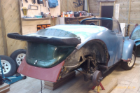 Har en liten idé om at eldre >65 dører (eller aller helst Karmann) gjør seg på roadstere, siden du da får en høyere profil som passer med begynnelsen på glassfiberdelen? De fleste roadstere jeg har sett har nyere dører, tror det kunne blitt litt mer harmonisk.