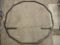 Denne krever litt gulvplass, men er veldig grei å lage og bruke. Jeg valgte å ikke lage den todelt, samt at jeg gjorde en liten brøler da jeg kappet opp rørene og ble nødt til å skjøte inn en bit i ringen for å få den til å passe. Følger en målene jeg gir under, skulle ikke det være nødvendig. Å lage dette er selvfølgelig helt på eget ansvar. Du bør være rimelig sikker på at du har gode nok sveiser før du lager noe slikt. Mindre justeringer av mål kan være nødvendig.