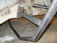 Det en vil oppdage når en legger bilen på siden nå er at takrennen vil være et par cm nærmere rammen i bunnen enn når den er oppreist. Stål tåler jo heldigvis å bøyes litt veldig godt, men ønsker en å sveise på bilen i denne stillingen ønsker en ikke at den skal være vridd. Jeg laget meg derfor et par enkle sidestøtter.