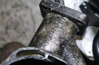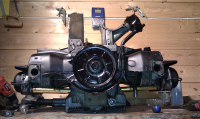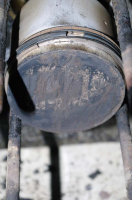 IMGP5559.jpg (192.92 KB. 1168x776 - vist 426 ganger.) Det var mange muttere å løsne for å få løs alt dette. Det er fort gjort å glemme noen så sørg for å sjekke ekstra godt før du begynner å benne og brekke for å få løs cylindre etc. Kjøleribbene tåler ikke allverden. Det var ganske greit å rikke ting løs når jeg hadde løsnet alle mutterene. Stemplene derimot var ikke bare bare. Stemplene mine satt fast i rådene med en kryssbolt. På hver siden av den satt det to låseringer. Låseringene ble tatt ut og da skulle det normalt være ganske greit å løsne stemplene. Dette var IKKE tilfelle! Her måtte jeg inn i nabogarasjen og rekvirere en hjelpemann. En holdt i stempelet slik at det ikke skulle smelle bort i noe og bli skadet, mens en annen slo ganske så hardt på bolten for å få den løs. Verktøy vi brukte: Hansker, Pipe 15, Pipeforlenger, Gummihammer.