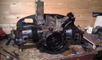 Jeg har tidligere hatt ute motor på denne bobla. For først byttet jeg motor siden den ikke ville gå lenger, og jeg hadde en turnkey liggende. Jeg hadde da hatt problemer med at motoren "sluret" i det jeg giret og gav gass. Når motoren var ute oppdaget jeg at det var masse olje i hulerommet på girkassa som åpenbarte seg. Dette ble rengjort og ny clutchdisk + ny brukt motor satt inn. Denne fungerte som smurt, men etterhvert endte jeg opp med samme problem, der motoren sluret seg bortover ved gasspådrag. Forrige sommer tok jeg motoren ut igjen og regnet med at det måtte være et eller annet feil med pakningen inn mot girkassa. Denne ble byttet. Det fungerte fint, men så skjedde det samme igjen. Slik så girkassa ut etter at jeg fjernet motoren denne gangen
