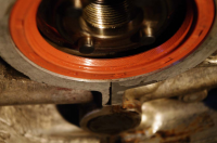IMGP5599.jpg (90.4 KB. 1168x776 - vist 368 ganger.) Ny simmering (rød type av silikon og ikke svart type av gummi) ble montert. Fikk tips om at det var best å finne noe som trykket jevnt på hele simmeringen og så dunke lett med en hammer. Var ikke mye å oppdrive men prøvde med en tapekjerne og en planke utenpå der for å på jevnt trykk på kjernen. Dette gav jeg opp ganske raskt og gikk over til lette slag med gummuhammer på pakningen. Dette fungerte fint. Jeg smurte motorolje på utsiden av simmeringen slik at den skulle gli lettest mulig på plass.