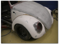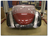 Enig! Fremskjermene ble knallbra, men bakplata og bakskjermene passer ikke like godt i lag. Har du noe planer der eller? Engelsk hjulet må nok muligens frem, eller kutte litt av bakskjermene kanskje.......  Kult roadsterprosjekt! Jeg solgte mitt alt for billig for ca 10 år siden.......