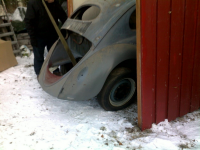 Egentlig skjønte jeg ikke helt hvordan jeg skal måle  Tvilende men har vert litt i garasjen og fått løsnet bremsene og fått i luft i dekkene, så nå ruller den Osteaktig og har også ryddet ut det som lå inni bilen og fått bort noe av støvet på bunnplata, den så egentlig ganske bra ut, det er en del sveising i karroseriet men ikke alt for mye.