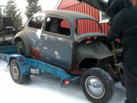 Egentlig skjønte jeg ikke helt hvordan jeg skal måle  Tvilende men har vert litt i garasjen og fått løsnet bremsene og fått i luft i dekkene, så nå ruller den Osteaktig og har også ryddet ut det som lå inni bilen og fått bort noe av støvet på bunnplata, den så egentlig ganske bra ut, det er en del sveising i karroseriet men ikke alt for mye.