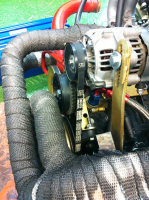 Så nå har jeg byttet til lengre reim og montert et følgehjul som gjør at reima griper nesten 180 grader av vannpumehjulet. Håper dette løser problemet og at reima ikke missliker turen innom følgehjulet.