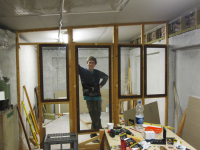 Satt opp skillevegg og bygget dør av noen gamle vinduer vi fikk: