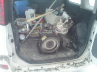 Etter at det har begynt å lekke fra oljepumpe dekslet og noen av skruene til oljeavtappings lokket, har jeg bestemt meg for å ta ut motoren og gjenget opp på nytt. Begynte i går med demontering.