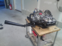 Grenrøret ble i veien, så det måtte av. Gjenstår bare å skru fast motoren og koble olje-slanger. Tar den et par tørninger på starteren før jeg monterer videre, bare for å høre om alt virker bra...