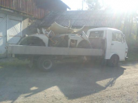 Dagens jobb: Først måtte jeg rygge meg gjennom 30 meter med meterhøyt gress. Så måtte vi løsne bremsene på, og flytte en bil som sto i veien.  Deretter pumpet vi luft i dekkene med medbragt kompressor. Bremsene på denne bilen måtte også løsnes. Så måtte vi dra bilen ut av lokalet ved hjelp av jekketalje, garasjejekk og slepetau gjennom en åpning med bare 1 cm klaring på hver side. Jeg klarte selvfølgelig ikke å dra bilen opp på oversiden av fjøset, for lastebilen bare spolet i gressbakken. Derfor måtte jeg laste bilen på det verst tenkelige stedet. Med ekstra vekt på bakakselen klarte jeg til slutt å komme meg opp gressbakken, bare for å oppdage at drivakselen på lastebilen så ut som brystkassa på en tysk pornoskuespiller fra 70-tallet. Da var det bare å krype under å skjære løs omtrent en høyball med kniv. Gode fem timers jobb, og mye god læring i dag. Viktigste lærdom også denne gang: Alt går.
