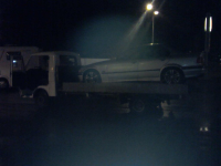 Vi var utpå en liten tur i går kveld også. Tror du faen ikke den forvokste DKWen klarte å ryke det nye båndet på vinsjen min? Heldigvis hadde jeg festet den i en jekketalje som back up, også, så den stakk ikke av. Pleier å gjøre det under lasting av tunge biler. Man lærer jo noe underveis. Legg også merke til den deilige hjulstroppingen. Det er en fornøyelse å kjøre rundt på selv tunge biler når de ikke står og røsker i stroppene.