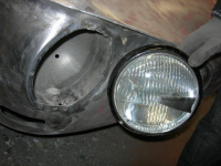 Ny lyktebrønn,  de gamle lyktene var skrudd rett i skjermen uten justeringsmulighet. NOS lykteinnsatser fra Sverige med blenna asymetri for venstrekjøring.