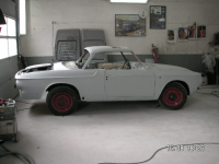 Første strøket med lakk, svart og hvit tak som er originalfargen på bilen.