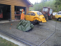På tie med ny tråd, pga ny bil  Innpå forumet til VWACB i bergen dukka da opp ei flott gul sparebobla til ein rimleg pris. Sikla ei stund på den men fant ut att eg hadde vel bila so eg klarde meg... so for ein kompis ned å skådde på den, og påpeika att da relativt lite rust.. då vart eg jo plutsleg sugen igjen, og ettersom ingen andre hadde meldt si interessa i salgstråden endå so fant eg ut att eg måtte slå på tråen. Fekk den rimligare enn prisantydinga, noko som gjor da til eit kupp. so då vart henting planlagt, prøveskilt vart kjøpt og eg begynte å leita framm verktøy og deler i garasjen. Bilen e altso ei 75modell 1200 bobla(sparebobla) Og den hadde stått i 8-10 år i den garasjen den stod i. Men selgaren sa att den hadde vert kjøyrd inn der etc så det skulle vera håp for å få liv i den  So då bar da avgårde til Blomsterdalen og der møtte eg ein hyggeleg selgar som viste meg gliset. Og snakk om luksus. bilen har budd 8-10 år i oppvarma garasje, i godt selskap ilag med ei 66 bobla(redda frå presso) og ein einar golf godt vekkgjøymt under allt slags greier. Etterkvart begynte skruinga; Da som vart gjort var å børsta av pluggane, vaska litt oljedrit rundt motoren, pussa og justera stiften, byta olja og so var slangane til vakumoptrekke dårlege, kappa endane av dei og det hjalp litt. Bensinen vart skifta og ny vart fyld på. satt i batteri med straum på og pussa litt irr, og so var da berre te å vri om nykkelen, vroom Starta me ein gong og gjekk ganske so greit! Var ikkje heilt go på tomgang til å begynna med men da kom seg snart. Lys og eletrisk fungerte ganske fint etter litt småfix på diverse. einaste var att viskarbladene var vekkmorkna. og da regna. etter skriving av kontrakt bar da iveg eit lite stykke vidare til der Tor Sperrevik jobbar. skulle henta nokon deler dar frå ei ex. vossabobla. Tor hadde heldivis eit bra viskarblad liggande!!! og so ordna han meg med nye vakumslangar ! Kjøyrde og boblo inn på verkstaden der og stramma inn styresneka. da gjor godt! etter å ha lesst opp bilen og følgebil med skjermar, deler og greier so bar da avstades til neste stopp hjå Tolo'en på Totland for å levera deler te Dalland &Co. på veg bort der kjendes bilen veeldig merkeleg ut, rista og skrangla noko alvorleg og eg venta berre på att ein hjul eller trommel skulle hopp av. men ikkje nokon plassar å stoppa på motorvegen der så eg fortsatte. kom meg opp te toloen med alle 4 hjul fortsat og tok ein innspeksjon. da viste seg att eine framhjulet var alvorleg laust.(strammemutteren var skrudd heilt ut til navkoppen) fekk låna jekk av Tolo og heisa bilen opp sånn att eg fekk stramma hjullageret. Då vart da bra. Heimøve turen gjekk ganske greitt. Ingen bremsa men da gjekk fint,håndbrekke virka jo. lite sikt, og ein motor som gjekk som ei klokka. egentlig ganske fresk fø å vera 1200, litt daff akselerasjon innimellom men gjekk bra likavel. Da eg angra mest på att eg ikkje hadde med var høyrselvern.... eksosen har hol overalt og bilen bråka noko agalaust! hadde skikkelege dåttar i øyrene når me parkerte heima i 1. tida på kvelden.. Bilen brukar forøvrig meget lite olja og meget lite bensin. Stopp utanfø camillas kro ved dalegården, fø å sjekka att alle hjul fortsatt hang på..