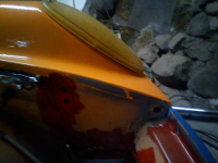 Sånn ser den ut når maskeringen er borte. Lakkjobben er ikke i stand til å skremme noen lakkerere til å tro at de skal bli arbeidsledige, men jeg synes det ble tøft. Jeg får nok en del tyn for den malinga, men med den nye motoren skal jeg klare å kjøre fra dere når mobbinga blir for mye å takle.