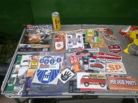 Vi har fått registrert oss og blitt utrustet med ymse armbånd for camping, utstilling og inngang. I tillegg fikk vi en 'goodiebag' med omfattende innhold. Tidsskrifter, program, reklame, nøkkelring, armbånd, en haug med klistremerker, en drops og en kondom var noe av innholdet.