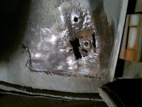 Ja jeg mener det samme!! Selvom jeg har kuttet litt på dette bildet var hullet STORT! går inn bak selve festet på begge sider! Ja den sveisen du ser nederst der er det ikke jeg som har sveist, ser ut som platen er lagt utenpå så vil ha av for å kikke bak!(se bilde med rennen! Hjørnet på bunnplaten der, er ikke akkurat skikkelig arbeid dette)