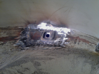 Ja jeg mener det samme!! Selvom jeg har kuttet litt på dette bildet var hullet STORT! går inn bak selve festet på begge sider! Ja den sveisen du ser nederst der er det ikke jeg som har sveist, ser ut som platen er lagt utenpå så vil ha av for å kikke bak!(se bilde med rennen! Hjørnet på bunnplaten der, er ikke akkurat skikkelig arbeid dette)