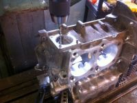 De gjengede hullene ble også boret ut til rundt 8mm. Fikk samtidig målt ut boltmønsteret relativt til de 49mm store hullene, slik at baseplater for plenumkammerne enkelt kunne lages senere.