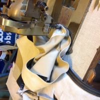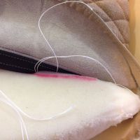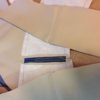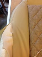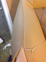 Har 3 dager fri, og håper å komme i mål med seteputene ila torsdag. Får se hvor langt jeg kommer. Bruker fransk søm, som det kalles, når jeg føyer sammen setet. Syr i hop, bretter det ned flatt og syr langs sømmen på begge sider. Det er ganske pent (og velkjent på bilseter), men det påfører ganske mye belastning på stingene i midten. Ett rift i tråden, og alt revner ganske fort. Ikke ukjent på nyere biler, heller. Tråden er som regel det første som går. Derfor legger jeg under en remse med sterk vinyl når jeg syr det ned flatt. Så sprer strekket seg over flere sømmer, og sømmen i midten "spriker" ikke så mye heller som det ellers lett gjør når alt henger i midtsømmen.