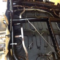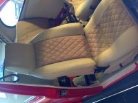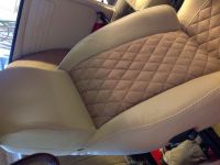 image.jpg (52.9 KB. 600x600 - vist 333 ganger.) Har 3 dager fri, og håper å komme i mål med seteputene ila torsdag. Får se hvor langt jeg kommer. Bruker fransk søm, som det kalles, når jeg føyer sammen setet. Syr i hop, bretter det ned flatt og syr langs sømmen på begge sider. Det er ganske pent (og velkjent på bilseter), men det påfører ganske mye belastning på stingene i midten. Ett rift i tråden, og alt revner ganske fort. Ikke ukjent på nyere biler, heller. Tråden er som regel det første som går. Derfor legger jeg under en remse med sterk vinyl når jeg syr det ned flatt. Så sprer strekket seg over flere sømmer, og sømmen i midten "spriker" ikke så mye heller som det ellers lett gjør når alt henger i midtsømmen. Her er sidefeltene oppå seteputa, samt skjørtet rundt (fremkant og sidene)ferdig.