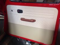 Da er første dør-trekk ferdig. Stoff fra taktrekket, skinn fra setene og ei gammel skinnjakke donerte skinn til dørhåndtaket (for de så litt lurvete ut!)