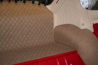I natt fant 3-åring ut at senga mi var bedre (heldigvis skjelden!). Etter et par spark der det gjør mest vondt, gikk jeg ut i verkstedet. Da var kl halv tre. Får mye ut av da'n på den måten. Så jeg rakk fire timer før resten av huset våkna. Putrer på med hjulbuer og hylla baki. For ikke å introdusere enda en farge, bruker jeg møbelstoffet som på setene (har ikke nok gulvteppe til alt, pluss at det er temmelig tjukt). Brukte litt tid med å formsy den tjukke felt'en som ligger under (kjøpt "ferdig"). ikke lett å få noe på rull til å følge en hjulbue. Så jeg skar ut små og store "eiffeltårn" som jeg snurpet igjen, og da fulgte det ganske bra. Snart ferdig med begge to, så tar jeg hylla bak setet. Undermatta er ferdig tilpasset.