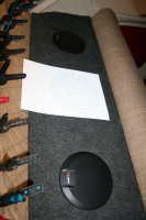 Har sydd trekket til hylla ferdig. Siden jeg trakk den tykke lyd-matta med møbelstoff, måtte jeg feste det med søm. Kontaktlim ville gitt tapt i løpet av en sommer. Ikke fordi 3M 90-limet ikke duger (langt ifra), men fordi disse materialene lar seg vanskelig lime! Så det ble litt improvisering. Vet ikke hvor mange sømmer det ble for å lage det rutemønsteret, men det gikk mye tid og myyyye tråd. Når hele plata i tillegg er på ca 1 kvm, ble det mange rare stillinger for å holde-nå frem til pedalen-se-styre. Vondt i ryggen! Nå ligger'n der. Ikke noe er festa ennå, i fall det er noe jeg ikke har tenkt på. (venter til alle delene er ferdige).